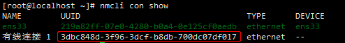 2、使用nmcli con show命令,查看网卡的UUID信息,记下UUID值